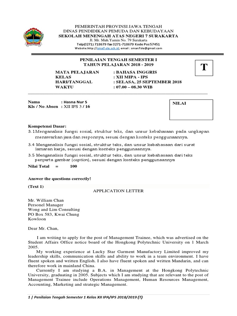 Inggris untuk sma/ma/smk kelas xii (wajib). Simak soal application letter terbaru 2021 bahasa inggris kelas 12 sma semester 1 lengkap dengan kunci jawaban. Friday, september 4 and 11 2020. As with all cover letters, a job application letter is divided into sections:1. Semoga berkah ilmunya ya mas dan mba dimensi bahasa inggris.